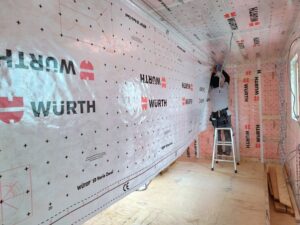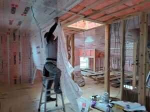 天井断熱材の充填が完了し、気密シートを貼ってます。