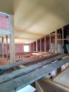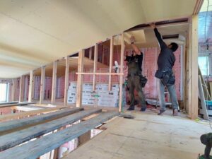 天井ボードの施工中です。