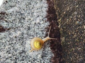 透明感のある殻に黄色いグルグル、始めた見るカタツムリ!