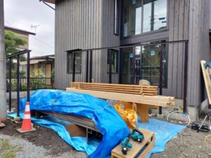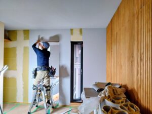 パテかけが終わり、塗り壁のような質感の環境壁紙「エコフリース」の