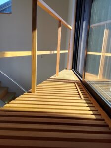 住宅の吹き抜け空間に設置すると、すのこを敷いて抜け感を出した通路みたな~