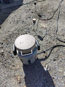 地面に貫入させ、25cm貫入毎にかける重さと回転数で地盤の強さを計測する調査方法です。