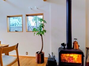 3月10日雪、薪ストーブの炎を感じながら癒されるモデルハウスの朝。