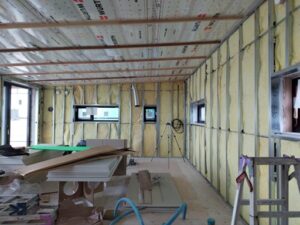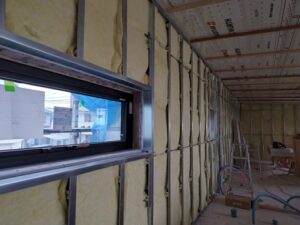薄い鉄板で、壁や天井などの骨組みを専門の職人さんが施工します。