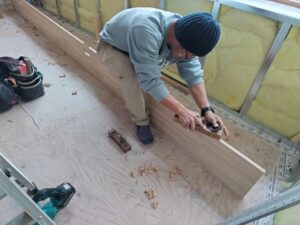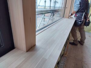 大工さん、窓枠を施工中。